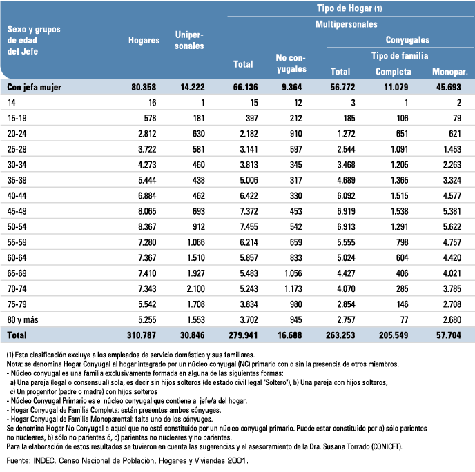 Hogares según sexo y grupos de edad del jefe por tipo de hogar.